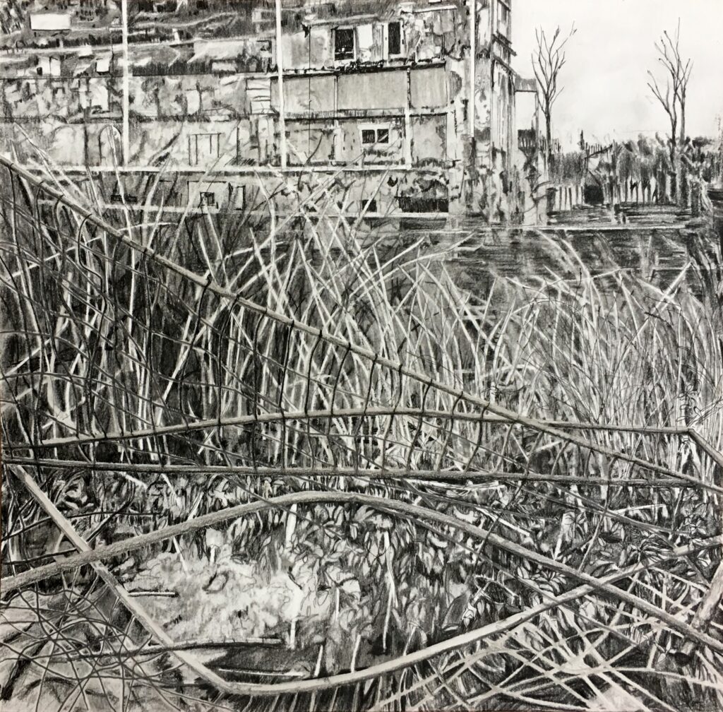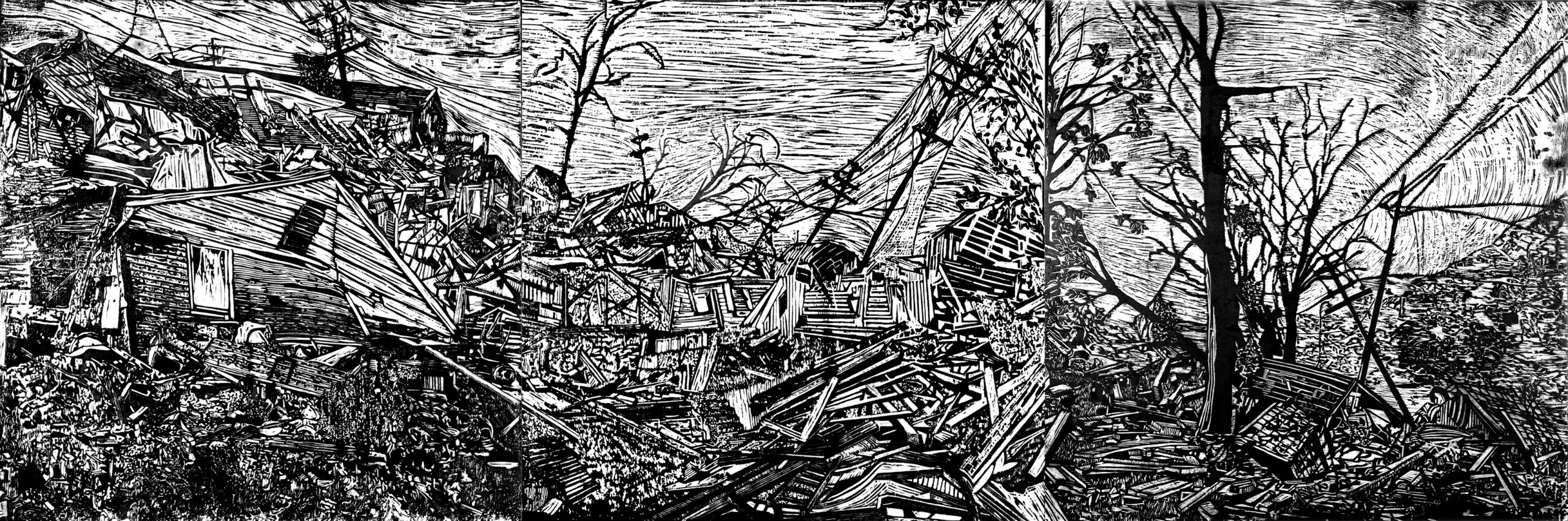 Découpage, collage, peinture sur canevas de tapis, mélange de textures, acrylique, encre de chine, gravure sur métal puis sur bois, aquarelle, elle gratte, elle imprime et retravaille… ses recherches constantes engendrent des œuvres qui en engendrent d’autres… tout est lié!